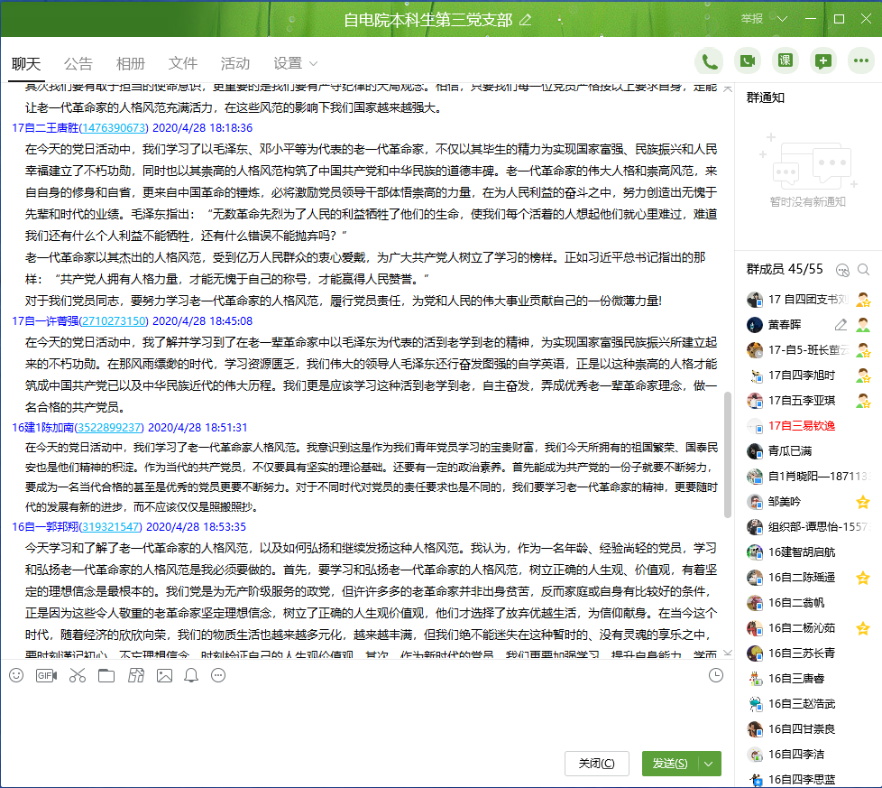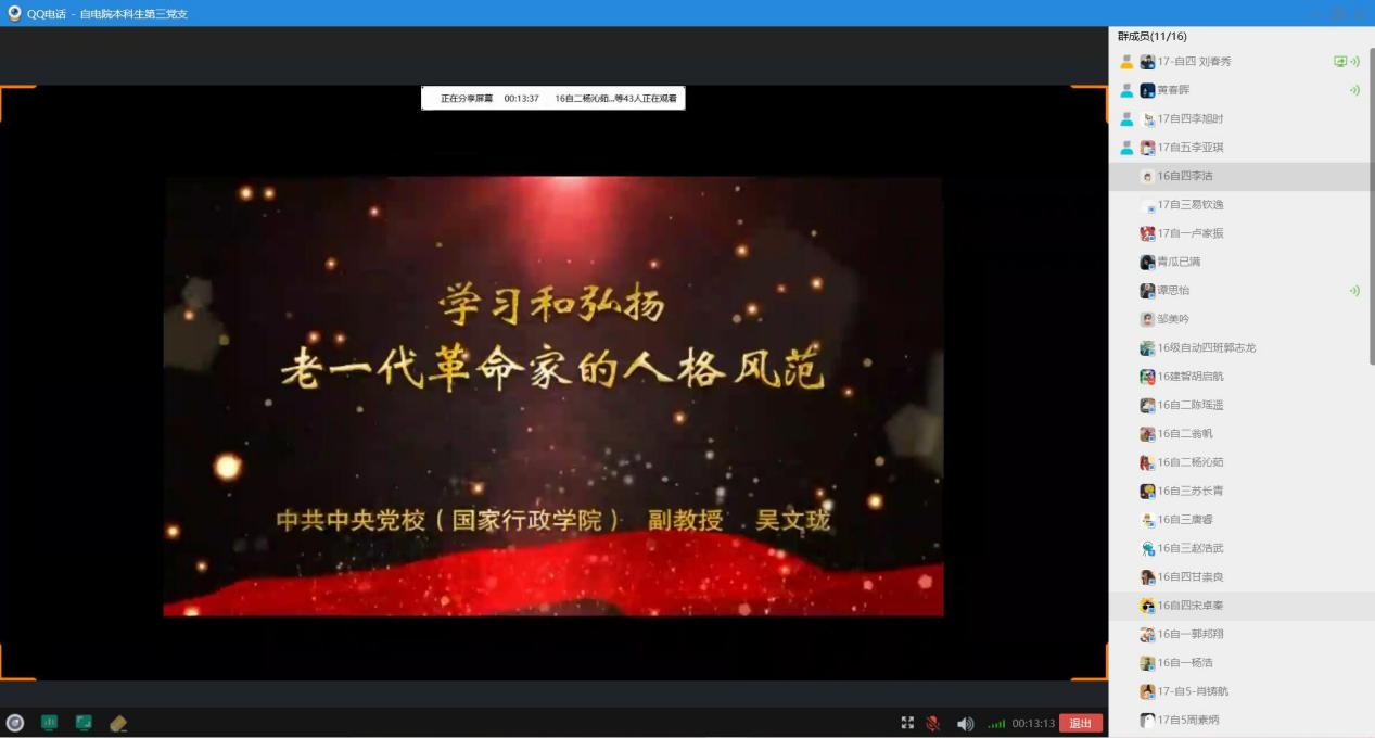 本科生第三党支部通过QQ群课堂在线上开展“学习和弘扬老一代革命家的人格风范”主题党日活动,旨在学习老一代革命家的人格风范,以此号召所有党员能够继承和发扬他们的精神。本次活动由支部书记黄春晖老师主持。