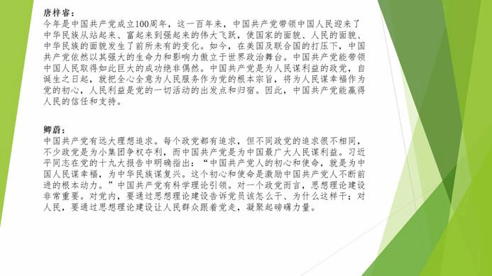 李彦同学认为:“中国共产党是为人民谋利益的政党,自诞生之日起,就把全心全意为人民服务作为党的根本宗旨,将为人民谋幸福作为党的初心,人民利益是党的一切活动的出发点和归宿。正因为中国共产党没有自身的特殊利益,因而能够将人民利益的实现作为执政取向和执政追求。为人民执政,这是中国共产党能赢得人民信任和支持的根本原因。”