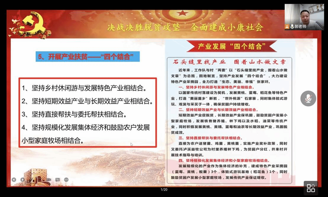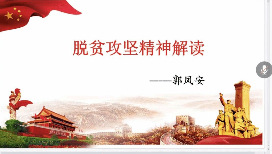 郭书记从脱贫攻坚彰显中国共产党的担当、了解伟大的脱贫攻坚战、脱贫攻坚精神诠释三个方面全面解读了脱贫攻坚精神。首先带领大家了解脱贫攻坚的相关政策,介绍了习总书记就打赢脱贫攻坚战召开的七个专题会议精神。课堂上,郭书记以自己的亲身经历深刻诠释了上下同心、尽锐出战、精准务实、开拓创新、攻坚克难、不负人民的脱贫攻坚精神。郭书记与其他干部在张家坪村组建驻村工作队时,以“石头缝里找产业,围着山水做文章”为扶贫规划,采取结对帮扶、教育扶贫、产业扶贫、科技扶贫等措施,助力张家坪村打赢脱贫攻坚战,圆满完成脱贫任务。郭书记表示:“扶贫干部不仅是农业技术员和财务会计员,也是政策宣传员和政府联络员,更是贫困户的服务员。”