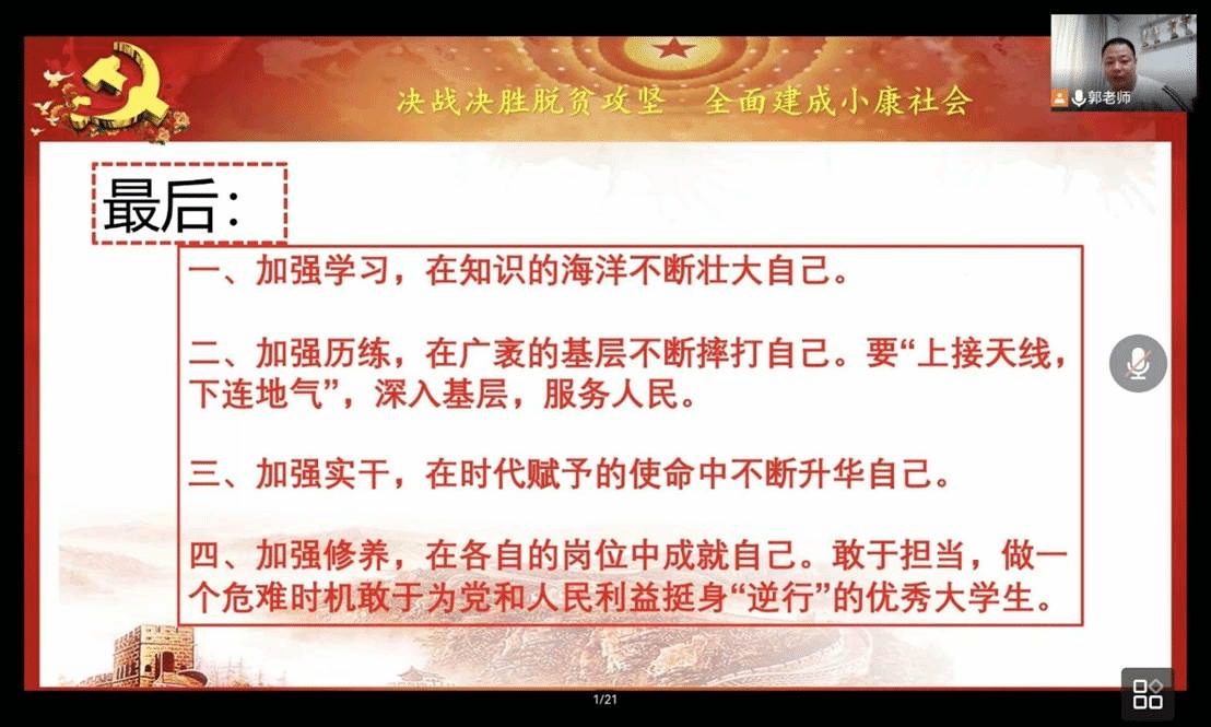 最后,郭书记号召全体学员加强学习、加强历练、加强实干、加强修养,做一个危机时刻敢于为党和人民利益挺身“逆行”的优秀大学生。