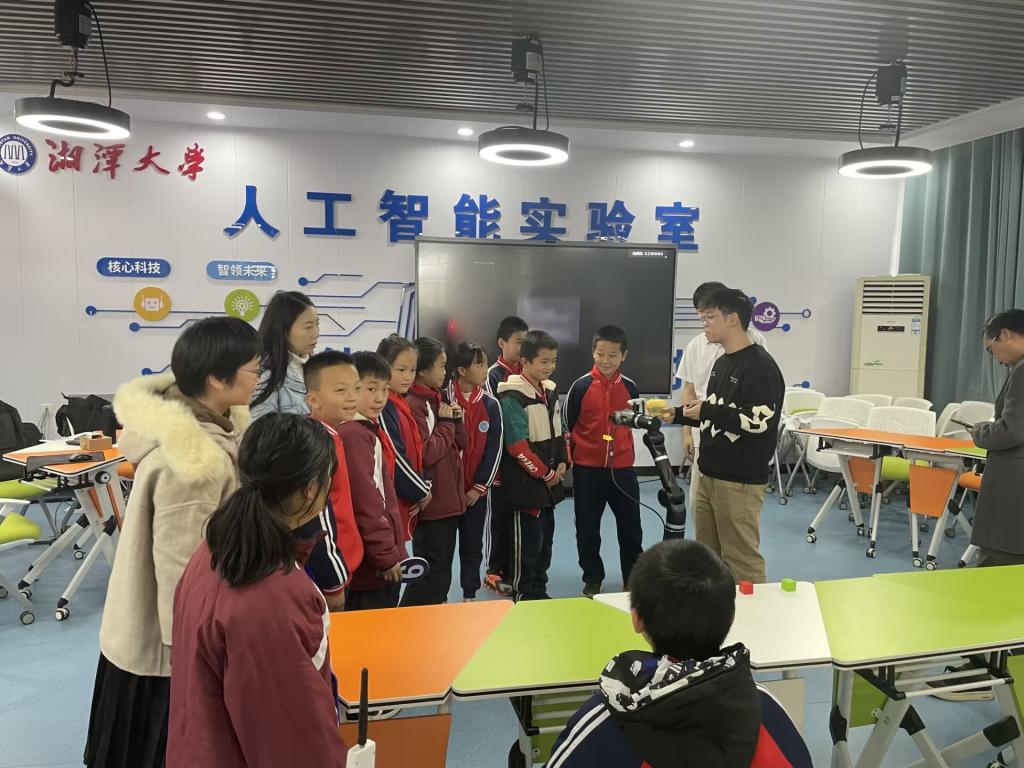 随后,支部党员带领长城中学43名师生抵达湘潭大学信息楼,分为两组开展活动。第一组首先到达信息楼301,参加由陈洋卓老师主讲的科普讲座,并欣赏了精彩的无人机飞行展示,再来到信息楼4楼人工智能科普基地进行学习,深入了解人工智能的奥秘和应用。而第二组则是与第一组同时交换场地进行的。无人机飞行展示以及人工智能实验室参观,对于引导中小学生热爱科学,开阔视野,养成独立思考、积极动脑的行为习惯具有积极意义,有利于扎实推动教育强国建设,为青少年学子将来投身现代化建设奠定坚实的基础。