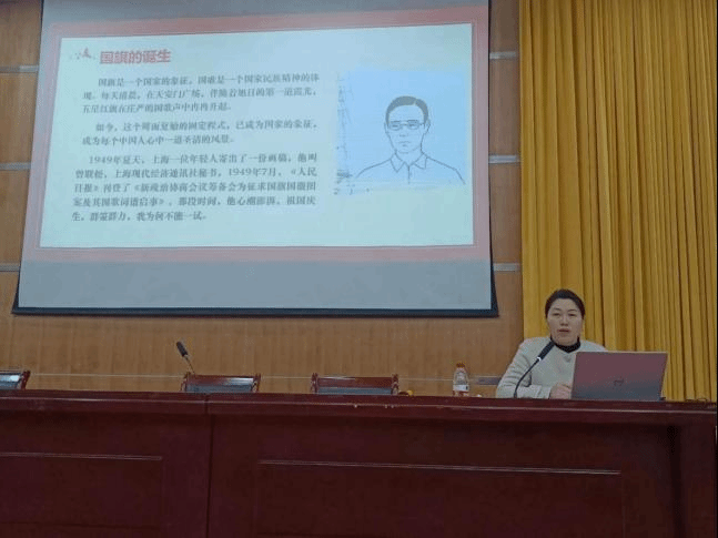 随后,讲座进入了国歌的部分。郭滟副书记带领大家一起看了一段视频,视频中讲述了国歌的前世今生,详细介绍了国歌的创作背景以及中国人民解放军军乐团音乐总监于海对国歌的守护。视频中还展示了利比亚撤侨时的情景,让大家深刻认识到唱国歌的重要性讲座最激动人心的部分是当全体起立奏唱国歌的时刻,现场气氛达到了高潮,每个人的眼中都闪耀着激动的泪光。