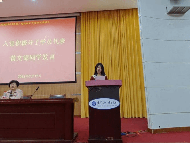 会议第三项,入党积极分子学员代表黄文锦同学发言。她对学院此次提供的学习机会表示感谢,并表示一定会珍惜此次机会,以实际行动争取早日加入中国共产党,做一名合格的共产党员。她代表全体学员向党组织表态:以严肃认真的态度认真参与本次入党积极分子培训班的学习,自觉加强党性锻炼和修养,努力做到学以致用。