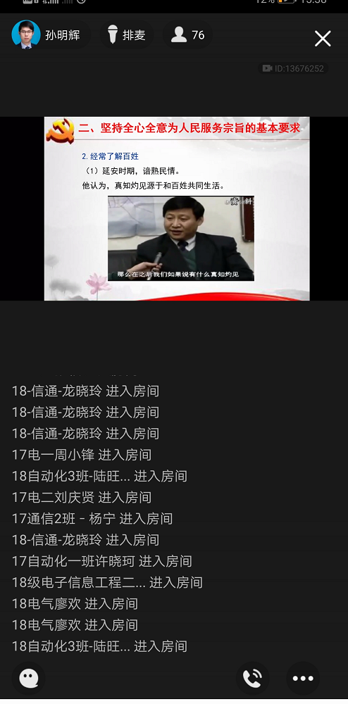 分党校举办发展对象培训班线上第四次专题讲座,本次专题讲座的主题是《坚持全心全意为人民服务——大学生如何践行党的根本宗旨》,主讲人是学院党委孙明辉副书记,参加本次专题讲座的有专职组织员刘桂珍老师、培训班班主任黄春晖老师以及全体学员。