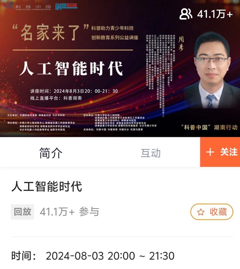 周彦教授在科普中国湖南行动“名家来了”上 开展《人工智能时代》公益讲座,受众达40余万
