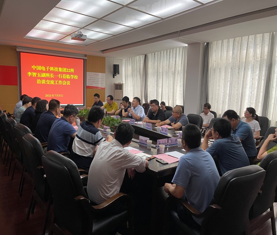 2021年7月5日上午9点在学校办公楼304会议室,中国电子科技集团22所李智玉副所长一行来我校洽谈交流,副校长葛飞带领科技处费俊杰处长、国家应用数学中心副主任黄牛武、陈玉莹副处长、数学院副院长袁海专,以及spbo足球比分