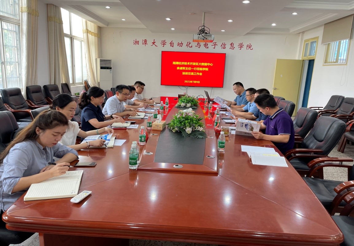 2021年7月9日上午9点在学院201会议室,湘潭经开区大数据中心副主任李松涛一行来spbo即时比分足球比分 洽谈交流。spbo足球比分 院长姚志强、分管科研工作的蔡成林副院长、分管教学工作的谭貌副院长、党委副书记郭凤安、谭平安委员、兰志勇博士出席了本次会议。