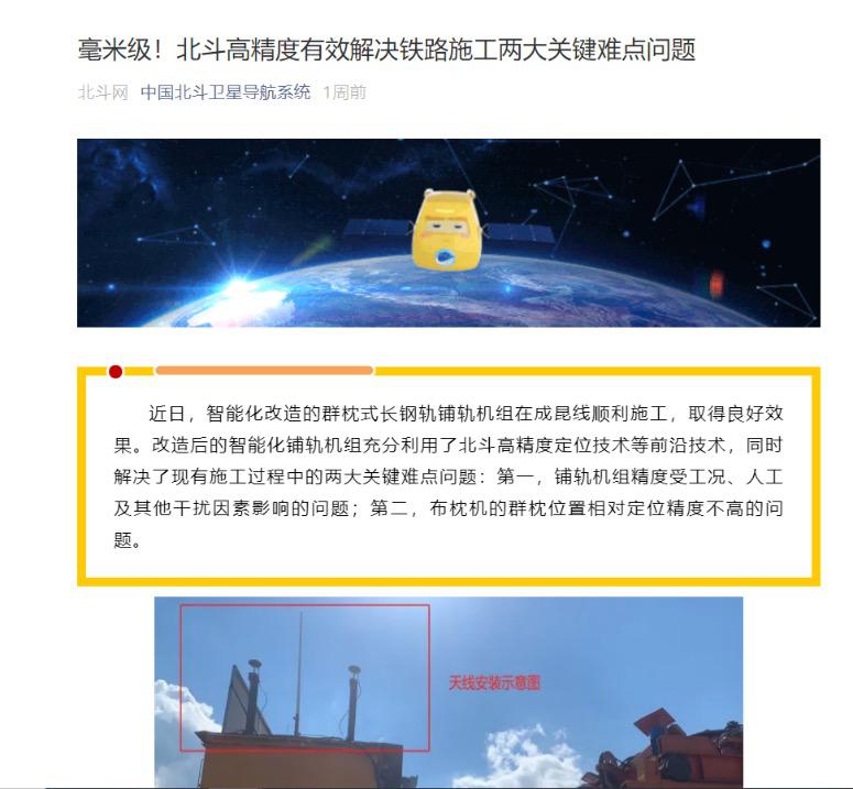 7 月 31 日,中国北斗卫星导航系统管理办公室在北斗三号全球卫星导航系统开通一周年的总结中,也对湘潭大学智能导航与遥感研究中心承担的《基于北斗高精度定位的智能群枕式长钢轨铺轨机组》项目予以高度赞誉。夯实中国质量,助推中国速度,该项目是北斗定位技术成功运用于轨道交通施工机械设备智能化改造的典型事例,开创了北斗卫星导航系统定位技术科技成果转化的新领域,拓展了北斗卫星导航系统相关技术在经济社会发展中的深化应用。
