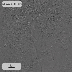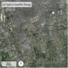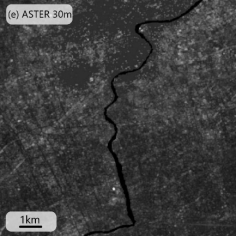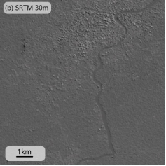 图1.上海浦东区域的DEM数据: (a)谷歌地球光学图像, (b) SRTM, (c) TanDEM-X, (d) AW3D30,(e) ASTER.