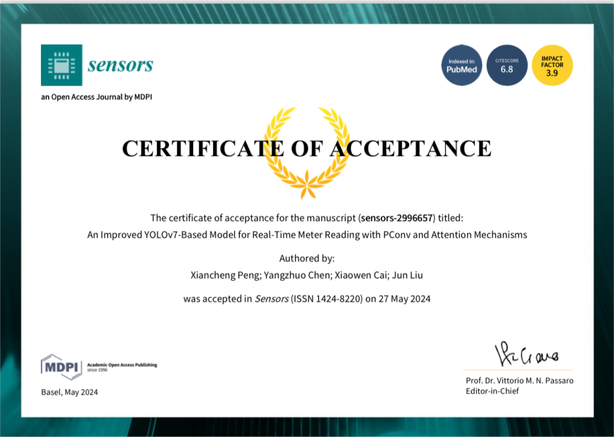 5月27日,由21级人工智能专业彭献铖同学为第一作者的论文“An Improved YOLOv7-Based Model for Real-Time Meter Reading with PConv and Attention Mechanisms”被SCI期刊Sensors(JCR:二区,影响因子:3.4)接收。