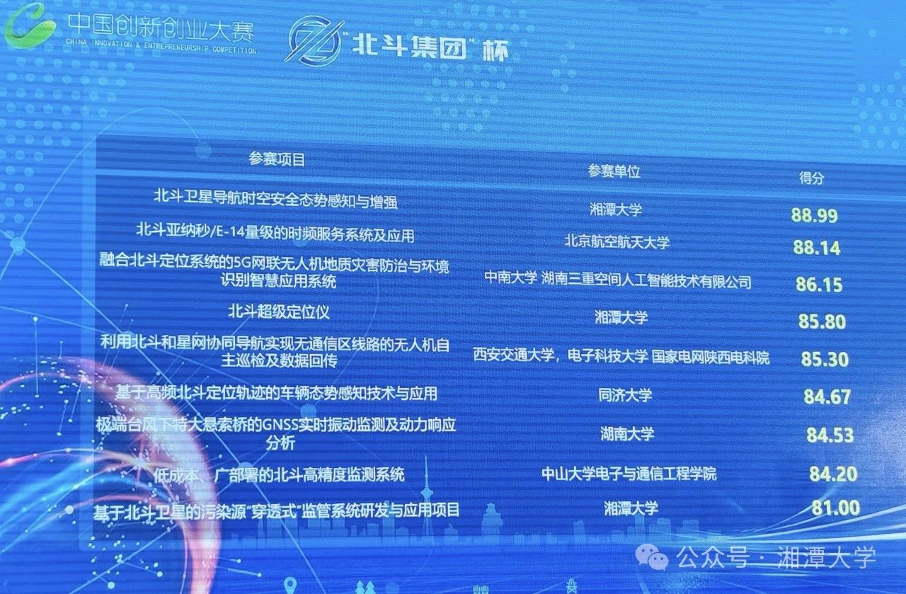 10月18日,决赛采取“8分钟自我陈述+7分钟答辩”现场答辩的方式进行。湘潭大学3个项目晋级决赛,其中《北斗卫星导航时空安全态势感知与增强》项目获团队组一等奖。
