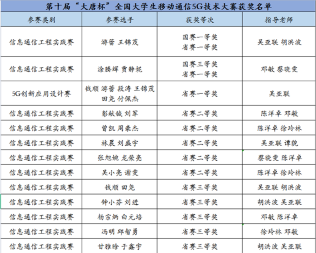 第十届“大唐杯”全国大学生新一代信息通信技术大赛历时8个月,进行了省赛、全国预选赛、全国总决赛三个阶段。本次大赛共吸引了全国500余所学校的3.5万余名学生参赛。经过激烈角逐,我校学子游蕾、王锦茂(指导老师:吴亚联、胡洪波)晋级全国总决赛并获一等奖,涂腾辉、贾静妮(指导老师:邓敏、蔡晓雯)获三等奖。