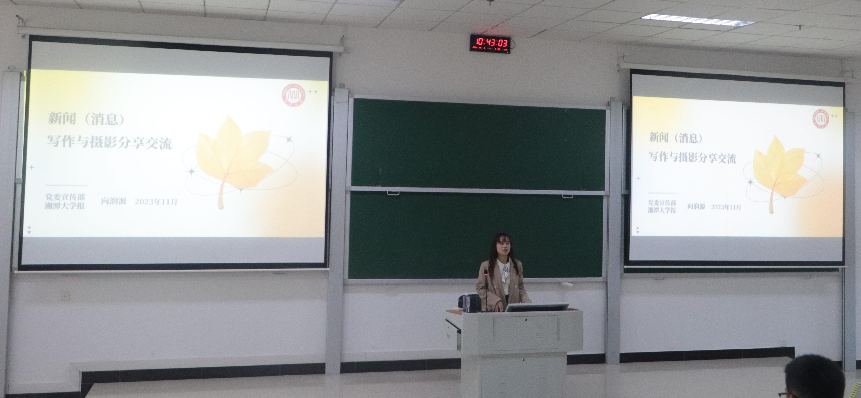 培训伊始,向润源老师围绕基本认知、消息的基础知识点、新闻角度选取和价值体现以及新闻摄影等方面进行专题授课。她强调,“作为校园媒体,受党委和团委的领导,我们的价值遵循是做好宣传思想文化工作,弘扬社会主义核心价值观;相比其他媒体,我们是宣传为第一要务,新闻是第二要务。”特别的,对于新闻摄影,向润源老师指出了各学院宣传工作者摄影时的共性问题,并对此提出建议。