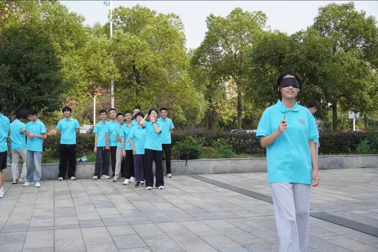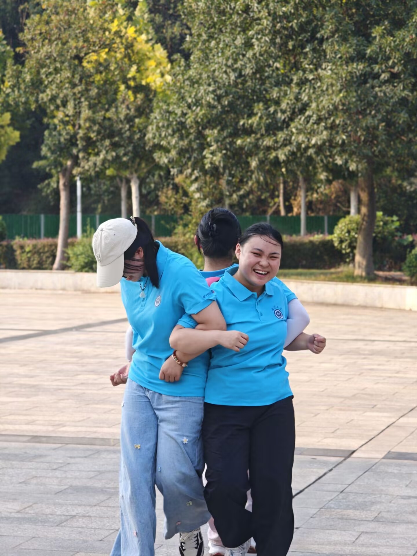 作为学院“10·10”世界精神卫生日系列活动的重头戏,本次素质拓展精心设置了“齐心协力”“手足相连”“纸杯传水”“背夹气球”等一系列兼具趣味性与挑战性的团队项目。这些活动不仅是体能的较量,更是智慧与协作的考验。在“盲人接力”项目中,队员们戴上眼罩,在黑暗中完全依靠队友清晰、准确的指令前行,深刻实践了信任与沟通的团队精神。而在“齐心协力”项目中,全体队员需步伐统一、节奏一致,任何一人的失误都可能导致前功尽弃,极大地培养了队员间的默契和集体责任感。