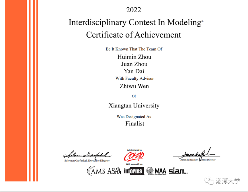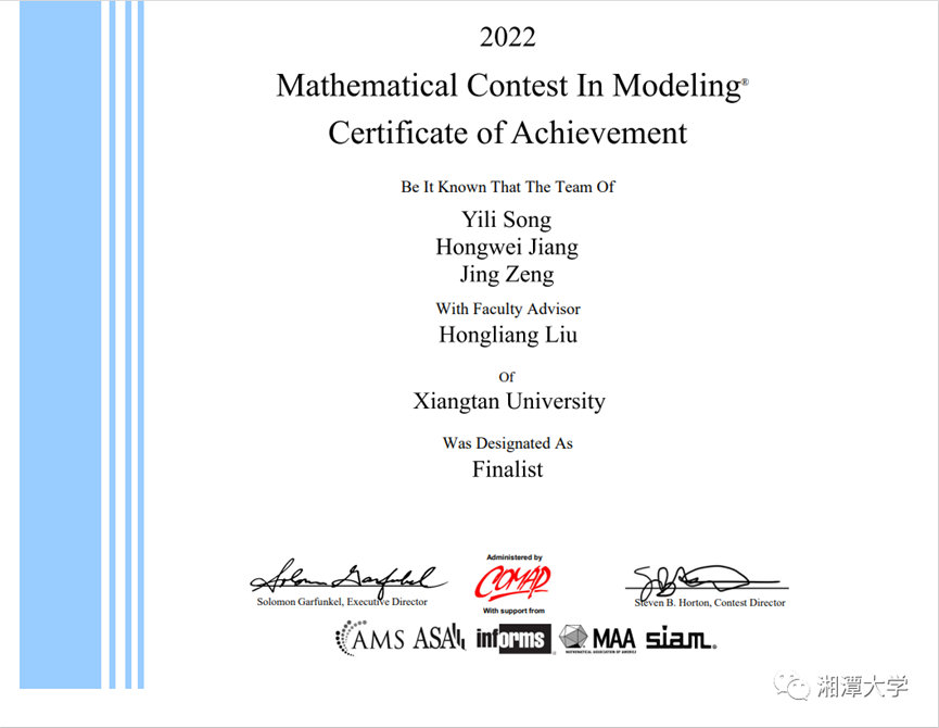 2019级电子信息工程2班宋贻立、蒋红伟,2019级自动化5班周娟三位同学在2022年美国大学生数学建模竞赛获特等奖提名奖。