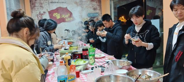 饺子包好后,大家来到餐厅,围坐在一起,共同享受火锅盛宴。丰富的食材摆满桌,热腾腾的火锅汤底散发着浓浓的诱人香气。这一刻,食物不仅满足了胃,更加深了同学们之间的感情。