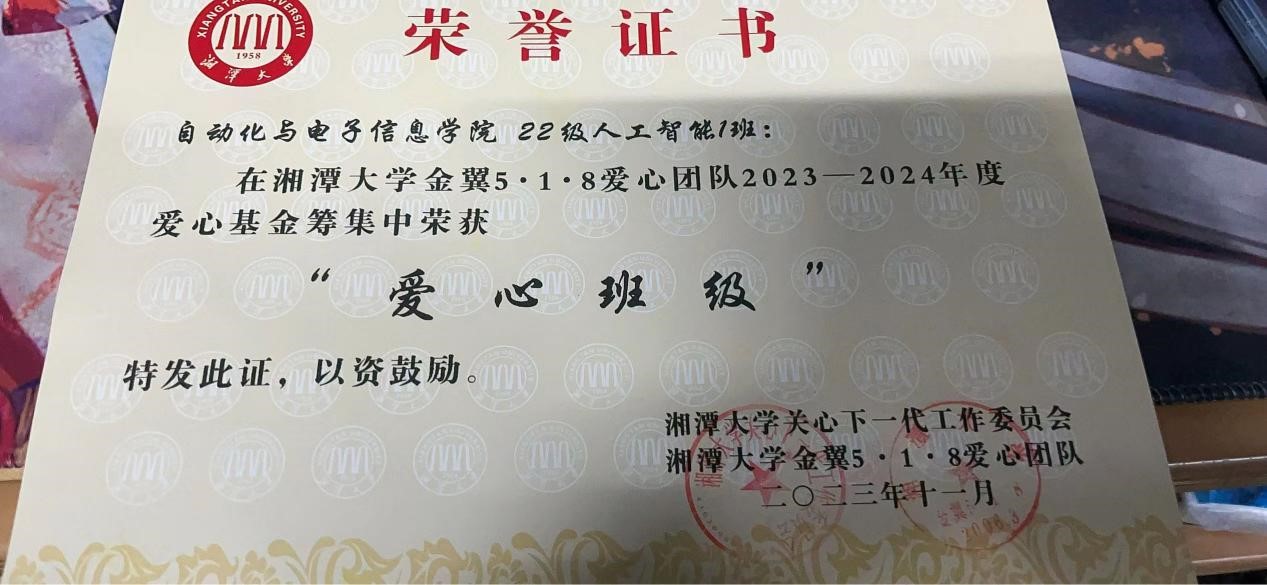 2022级人工智能一班在湘潭大学金翼5·1·8爱心团队于2023—2024年度爱心基金筹集活动中获得了“爱心班级”称号,这是本班在爱心事业中的又一次重要成就。