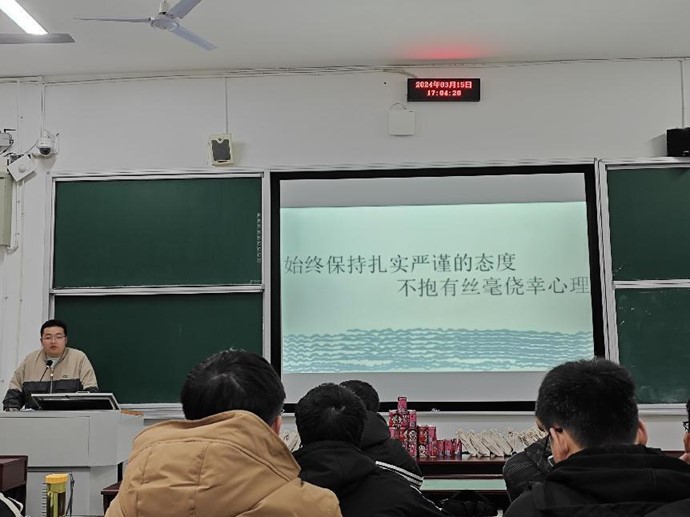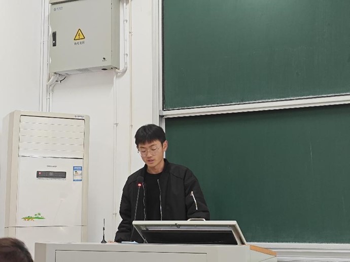 接着,三位班助合伙人相继发言。养辅杨四海对全班同学第一个学期的表现作出总结,他送给同学们三个“不等于”——学会不等于考得好,平时认真听不等于考得好,花的时间多不等于考得好,勉励同学们要重拾信心,不忘初心,努力奋进。此外,他告诉同学们要保持严谨谦虚地学习态度,“始终保持扎实严谨的态度,不抱有丝毫侥幸心理”。学辅张中豪上台为同学们总结了第一学期的学习与考试情况,分享了学习经验,并为大家对本学期课程做了学习方向指导与分析。英辅张双则为同学们总结了四级考试情况,对同学们的四级考试表现做出了肯定,为同学们讲解了六级备考的有关策略。