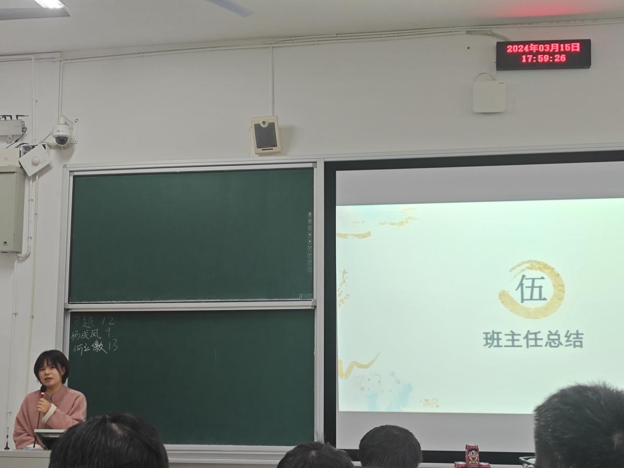 最后,蒋昱梅老师对班会进行了总结发言。她首先对获奖同学表示热烈祝贺,并鼓励其他同学向他们学习,努力提升自己的综合素质和能力水平。同时,她对班委和班助们的工作给予了高度评价和肯定,感谢他们为班级的发展做出的贡献,也感谢同学们的积极参与和支持。她希望同学们能够继续保持良好的学习和生活态度,不断追求进步和成长,努力实现自己的目标。