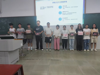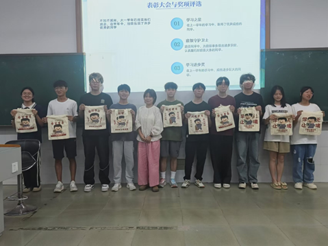 首先颁发的是“学习之星”奖。“学习之星”奖品是蒋老师精心挑选准备的六大名校联名笔礼盒,旨在表彰上一学年在专业排名中靠前的同学,鼓励他们更上一层楼。随后颁发的是“班级守护卫士”奖,此奖项旨在表彰在大一学年为班级积极工作、无私贡献的班委成员。此外,本次班会还特地设立了“学习进步”奖,以表彰上一学期排名进步显著的同学,鼓励他们再接再厉、再进一步。蒋老师分别为以上奖项获奖同学和班主任助理颁奖。