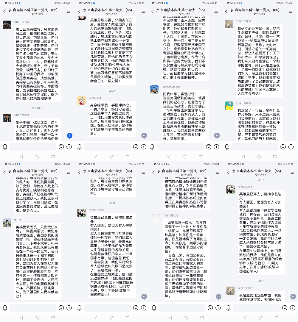 spbo足球比分 本科生第一党支部于2021年2月19日通过QQ群在线上迅速开展了“致敬英雄,学习英雄精神”主题党日活动,认真学习祁发宝、陈红军、陈祥榕、肖思远、王焯冉等官兵的英雄事迹和精神,支部全体党员深受感动,热血沸腾,在群里积极分享自己的学习心得体会。