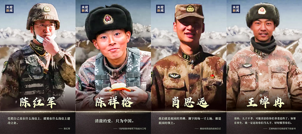 来自天南海北的一一茬茬官兵,坚守在祖国西部边陲—喀喇昆仑高原,用热血和青春筑起巍峨界碑。2020年4月以来,有关外军严重违反两国协定协议,在加勒万河谷地区抵边越线修建道路、桥梁等设施,蓄意挑起事端,试图单方面改变边境管控现状,甚至暴力攻击我前往现地交涉的官兵。面对外方的非法侵权挑衅行径,我边防官兵保持克制忍让,尽最大诚意维护两国关系大局和边境地区和平安宁。在忍无可忍的情况下,边防官兵对暴力行径予以坚决回击,祁发宝、陈红军、陈祥榕、肖思远、王焯冉等为代表的官兵英勇斗争,不惧生死,在这场边境冲突中誓死捍卫国土,最终以四死一伤取得了重大胜利,有效捍卫了国家主权和领土完整。中央军委授予祁发宝“卫国戍边英雄团长”荣誉称号,追授陈红军“卫国戍边英雄”荣誉称号,给陈祥榕、肖思远、王焯冉追记一等功。