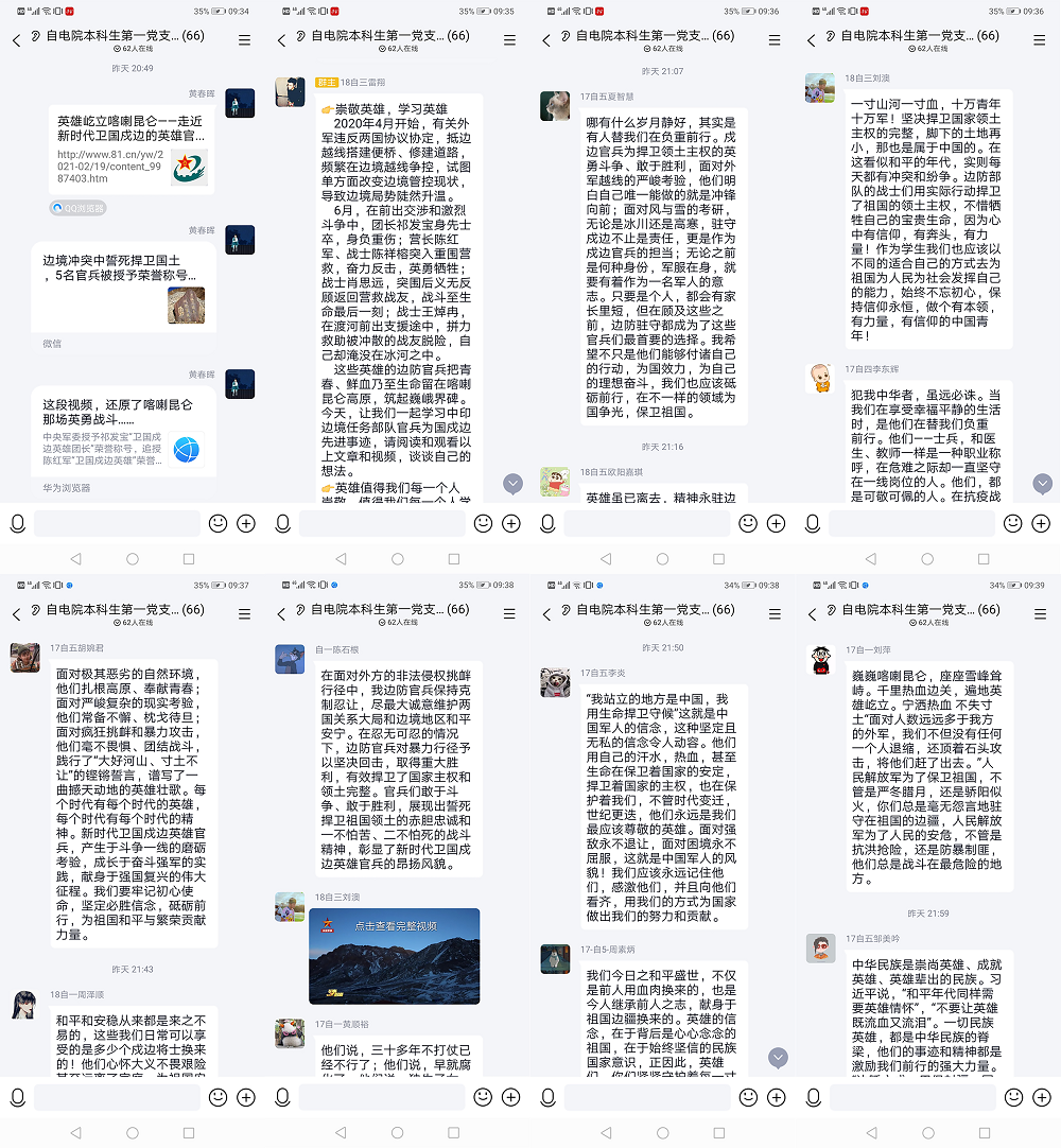 2018级自动化1班的刘澳说:“一寸山河一寸血,十万青年十万军!坚决捍卫国家领土主权的完整,脚下的土地再小,那也是属于中国的。在这看似和平的年代,实则每天都有冲突和纷争。边防部队的战士们用实际行动捍卫了祖国的领土主权,不惜牺牲自己的宝贵生命,因为心中有信仰,有奔头,有力量!作为学生我们也应该以不同的适合自己的方式去为祖国为人民为社会发挥自己的能力,始终不忘初心,保持信仰永恒,做个有本领,有力量,有信仰的中国青年!”