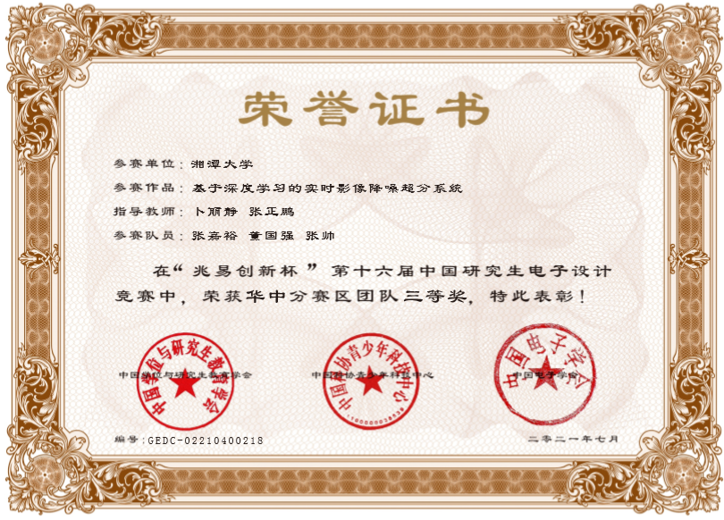《基于深度学习的实时影像降噪超分系统》(指导老师:卜丽静、张正鹏;团队成员:董国强、张帅、张嘉裕)荣获三等奖;