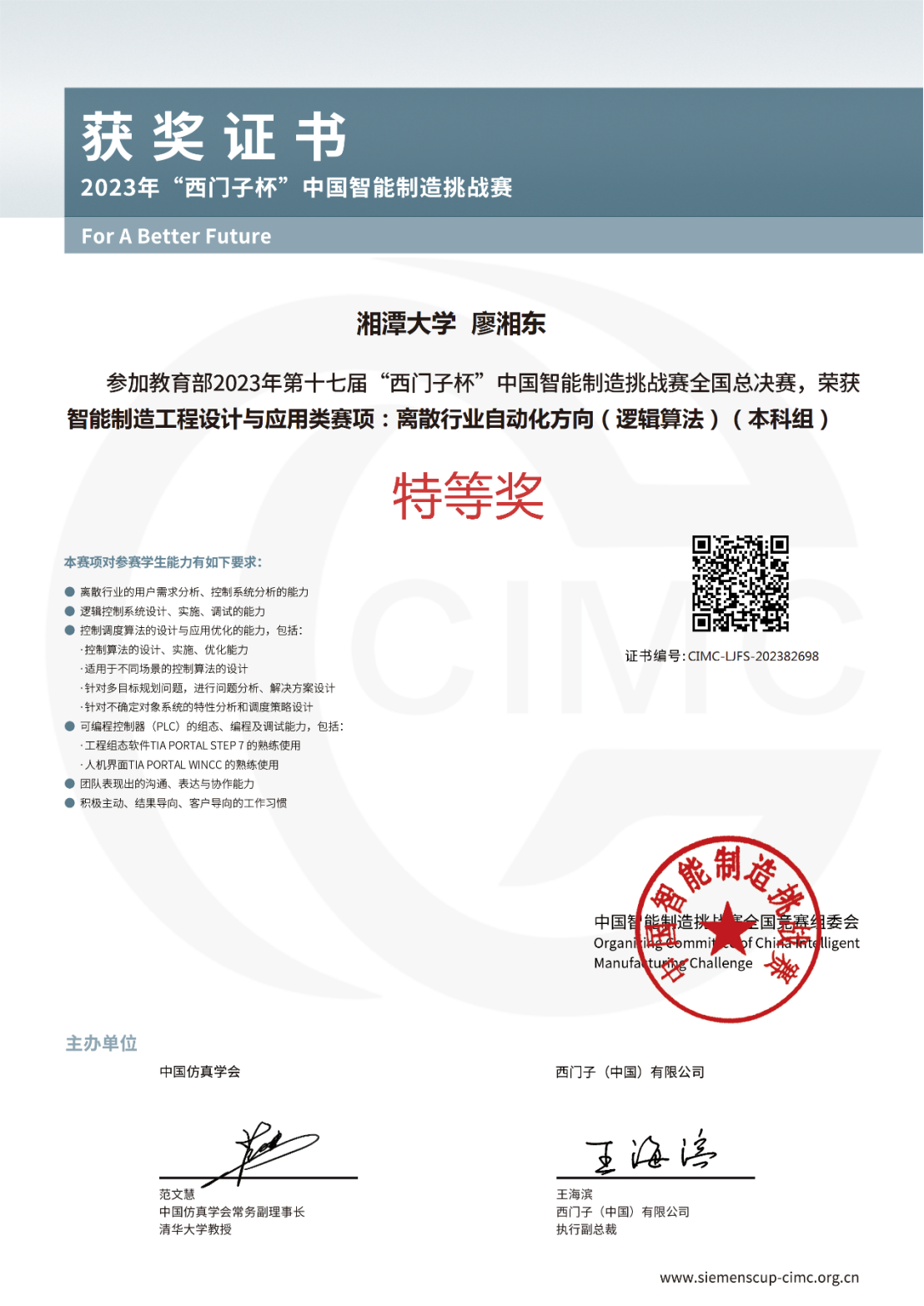 近日,2023年CIMC第十七届教育部“西门子杯”中国智能制造挑战赛全国总决赛在兰州理工大学落下帷幕。我院学生周惠柔、廖湘东(指导老师张莹)荣获离散行业自动化方向(逻辑算法)全国总决赛特等奖,这是spbo即时比分足球比分
