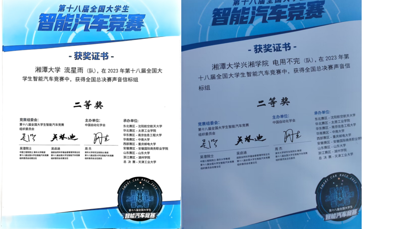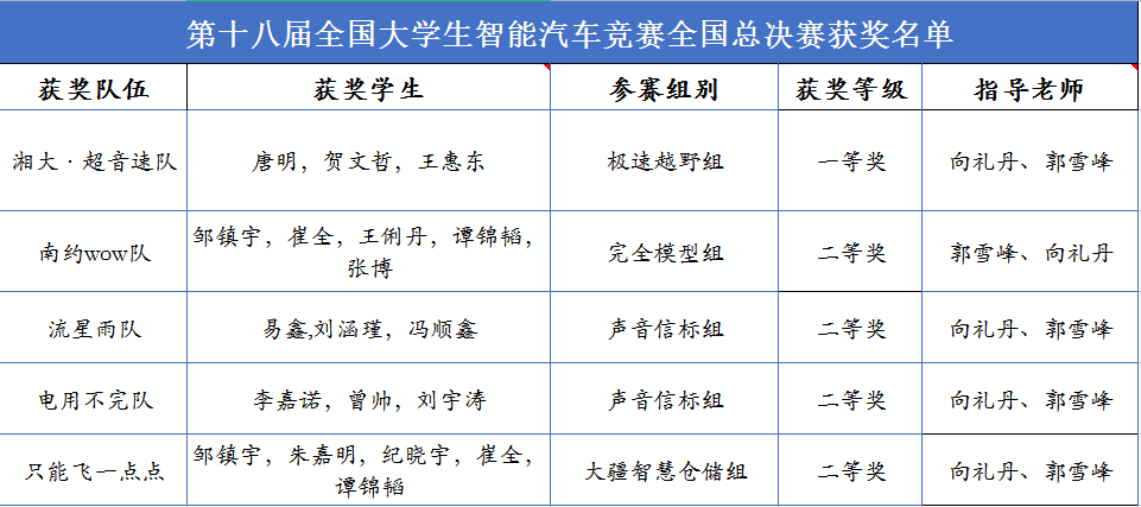 其中,湘大·超音速队(指导老师:向礼丹、郭雪峰)继去年室外专项赛取得国赛一等奖后,再次在室内竞速赛中取得突破,斩获国家一等奖。“南约WOW”队获得完全模型组全国二等奖,“流星雨”队获得声音信标组全国二等奖,“电用不完”队获得声音信标组全国二等奖,“只能飞一点点”队获得大疆智慧仓储组全国二等奖。