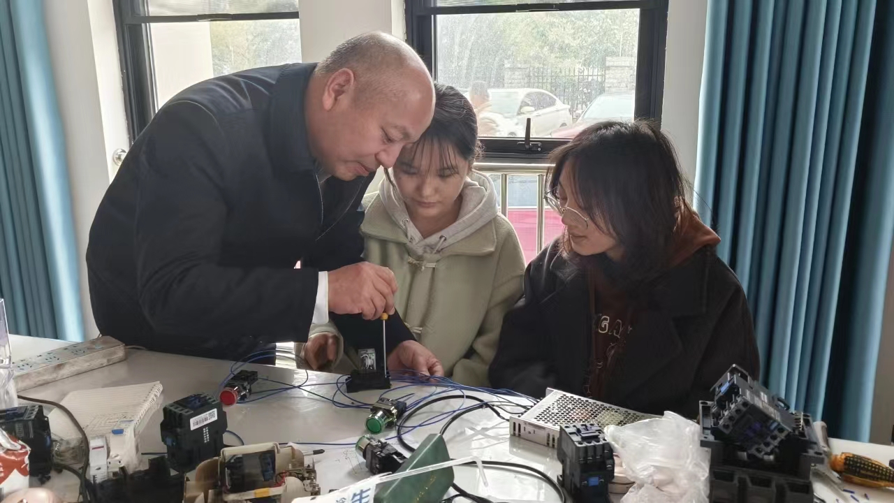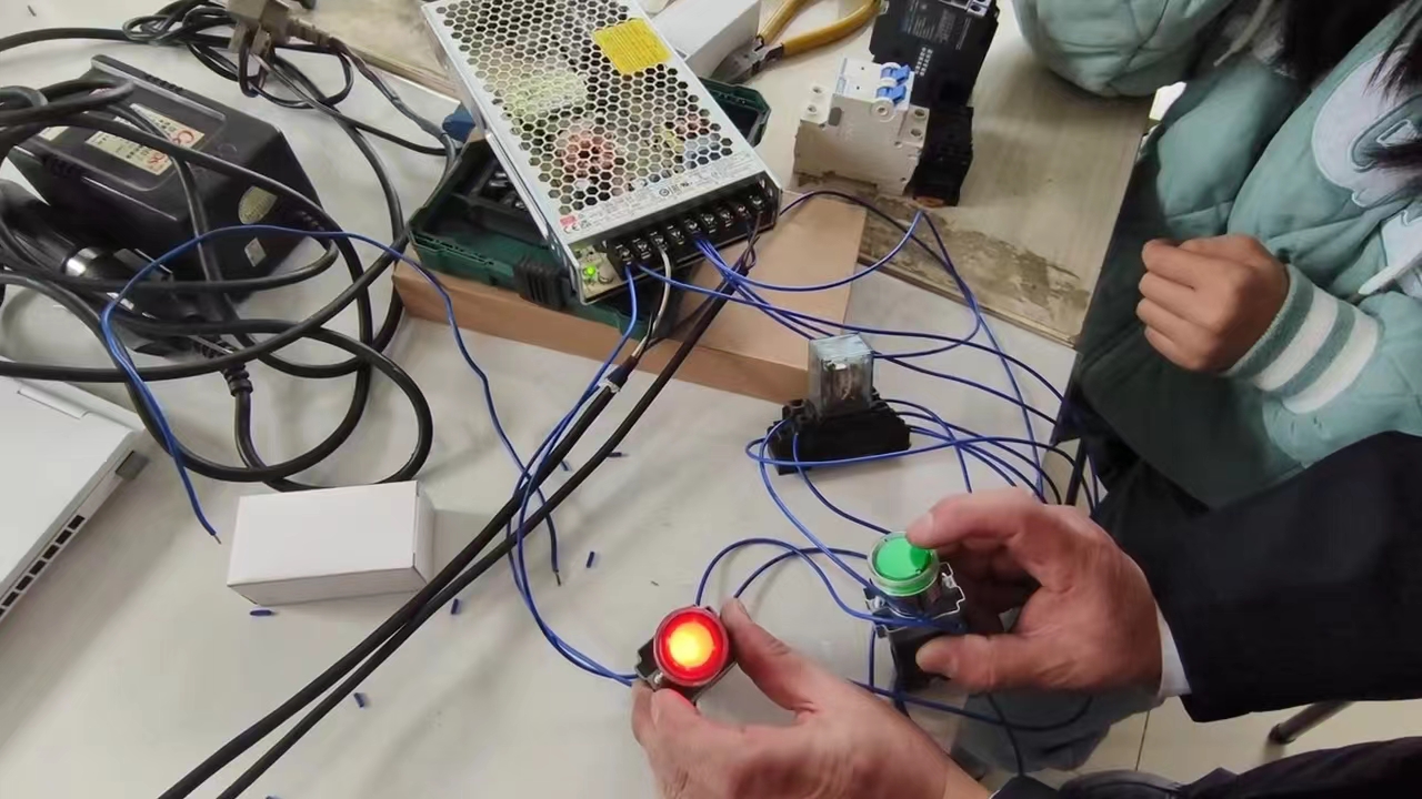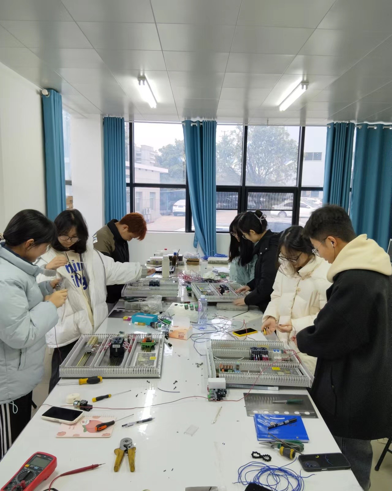 本次实习为期7天,由王华韬全程指导。学生代表先后参观了公司实验室等。王华韬为大家现场讲解了开关型号、规格、作用,接触器触点作用、按钮分类,保险以及继电器不同线路作用等五个基础元器件知识,并带领大家进行简单电路的组装。学生们根据电路图自主剪取电线、连接元器件,在不断试错与完善下,各个小组陆续完成电路连接以及相关任务。