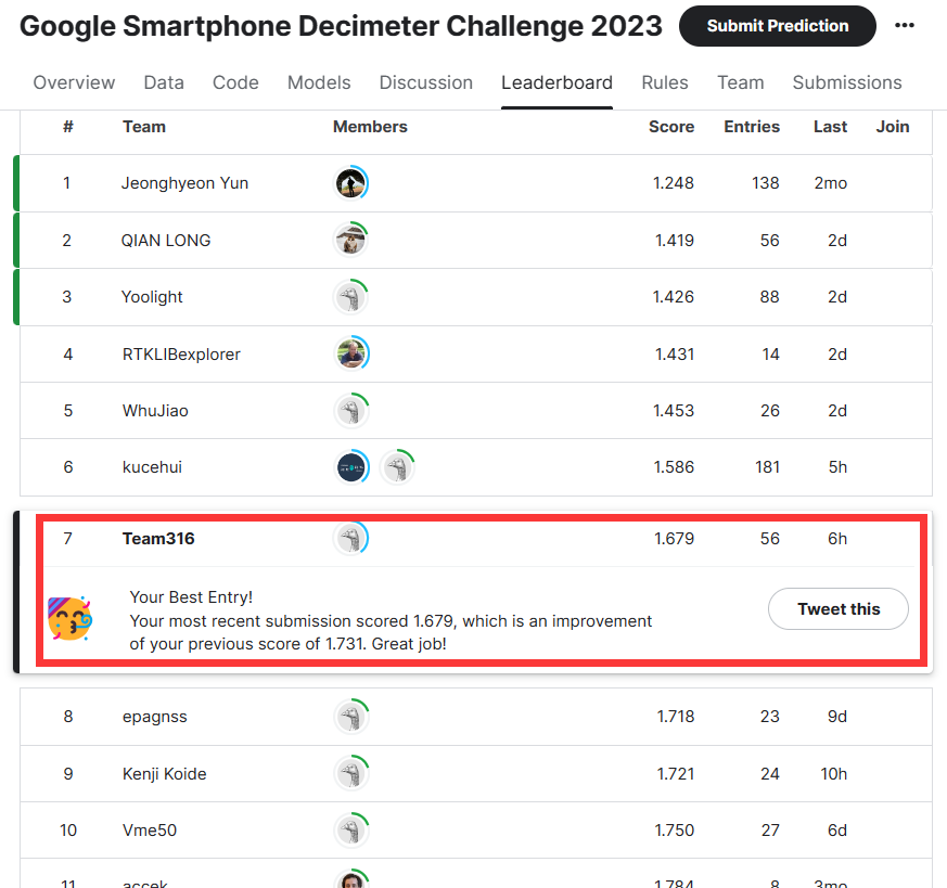 (实时排行榜://www.kaggle.com/competitions/smartphone-decimeter-2023/leaderboard)