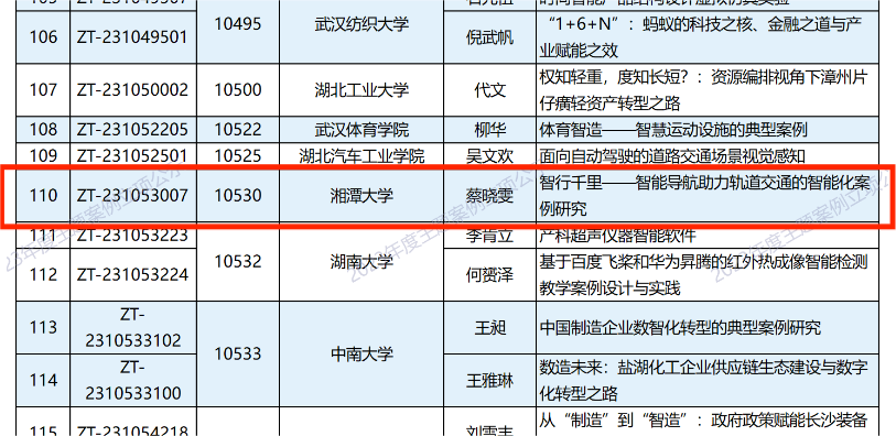 3月18日,中国专业学位案例中心公布了2023年度主题案例立项结果,经过“单位审核推荐”“专家分组评议”“案例专家委审核”三级评议审核,共对241家单位的655个申报项目进行立项。其中,湘潭大学智能导航应用中心蔡晓雯老师的“智行千里-智能导航助力轨道交通的智能化案例研究”获得“大国智造”主题案例的立项。