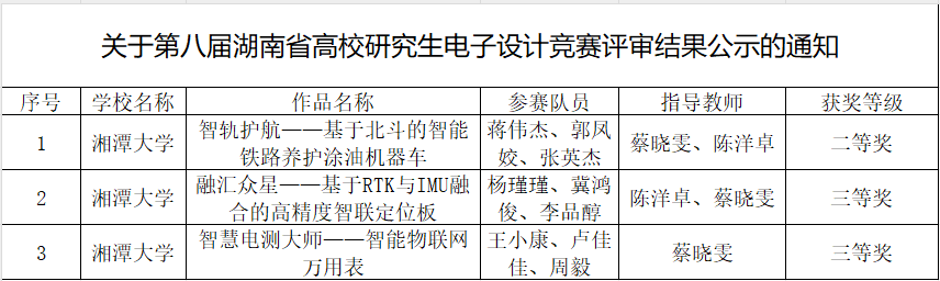 “智能可信导航与定位”省重点实验室学生以其卓越的表现,再次书写辉煌篇章,在第八届湖南省研究生电子设计竞赛中获二等奖一项,三等奖两项,在第五届湖南省研究生人工智能创新大赛中获一等奖一项。