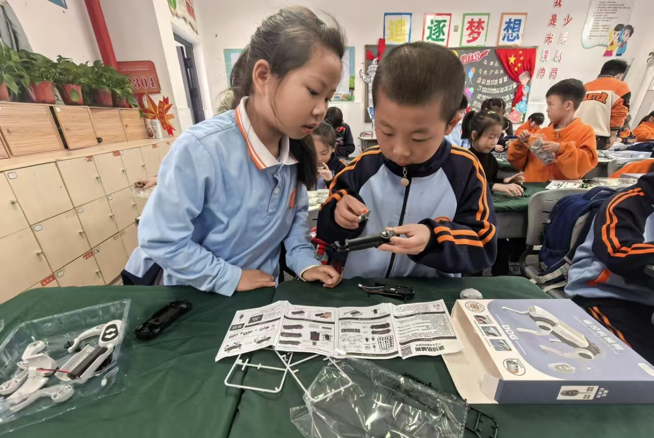 课堂还开展了一场热闹的“机械狗拼装大赛”,同学们两人一组,拿着拼装套件,对照说明书分工合作,有的负责安装“腿部关节”,有的专注连接 “传感器线路”……在团队老师的指导下,经过同学们的一番努力,一个个小巧的机械狗模型顺利完成,并兴致勃勃地进行了遥控机械狗赛跑。