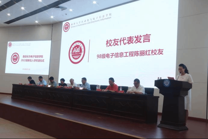 校友代表、2022级电子信息工程二班企业导师陈丽红回忆了自己在校的点点滴滴,跟同学们分享了自己创业的过程,她建议新生们做好规划,培养自己的核心竞争力;既要学会坚持,也要学会顺势而为。