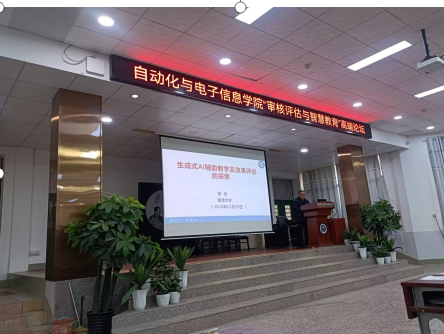 接着,我校专业认证指导中心主任段斌教授做了“生成式AI辅助教学及效果评估”的主题报告。段斌教授从时代背景、生成式AI辅助教学案例、生成式AI辅助教学持续改进措施的效果评估三个方阐述,基于工程教育认证的核心理念,以学生学习产出目标达成为主线,以产出目标评价机制为底线,将AI技术融入到主线与底线的各个支撑环节。通过教学改革前后的观察数据和实证分析基础上,建立因果图模型,挖掘潜在的中介机制或混杂因素,构成模拟随机对照实验。